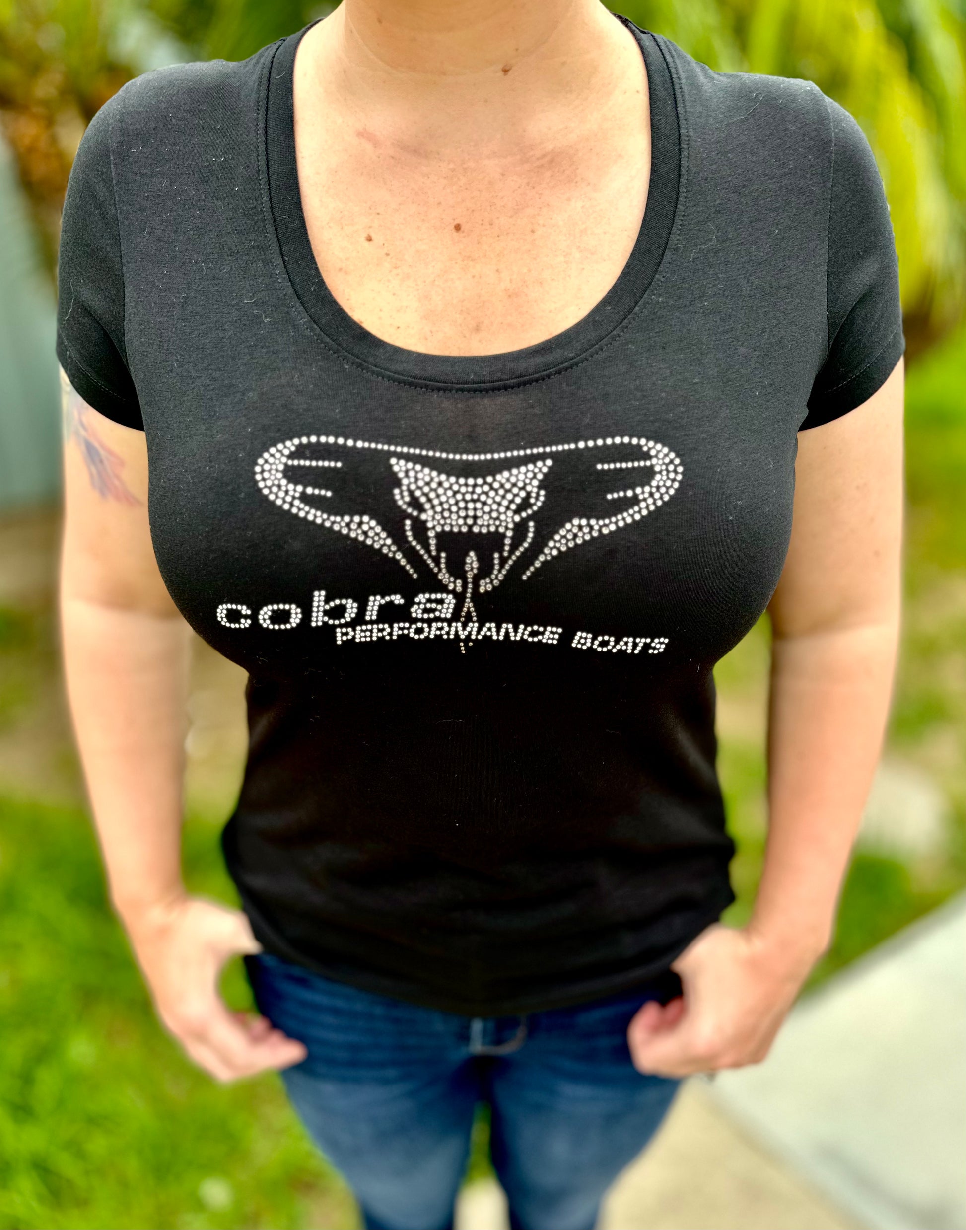 Snake head is in grey rhinestones and “Cobra Performance Boats” is in white rhinestones.
