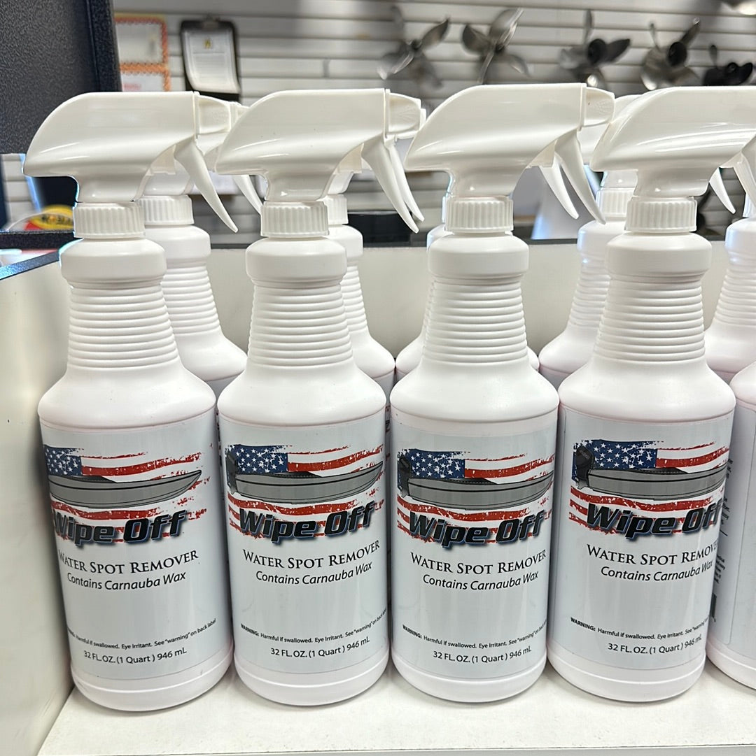 WIPE OFF: “Say goodbye to unsightly water spots with our specially formulated water spot remover product. Don’t let water spots ruin the beauty of your boat, automobiles, or chrome fixtures - our powerful water spot remover will keep it shining bright.”